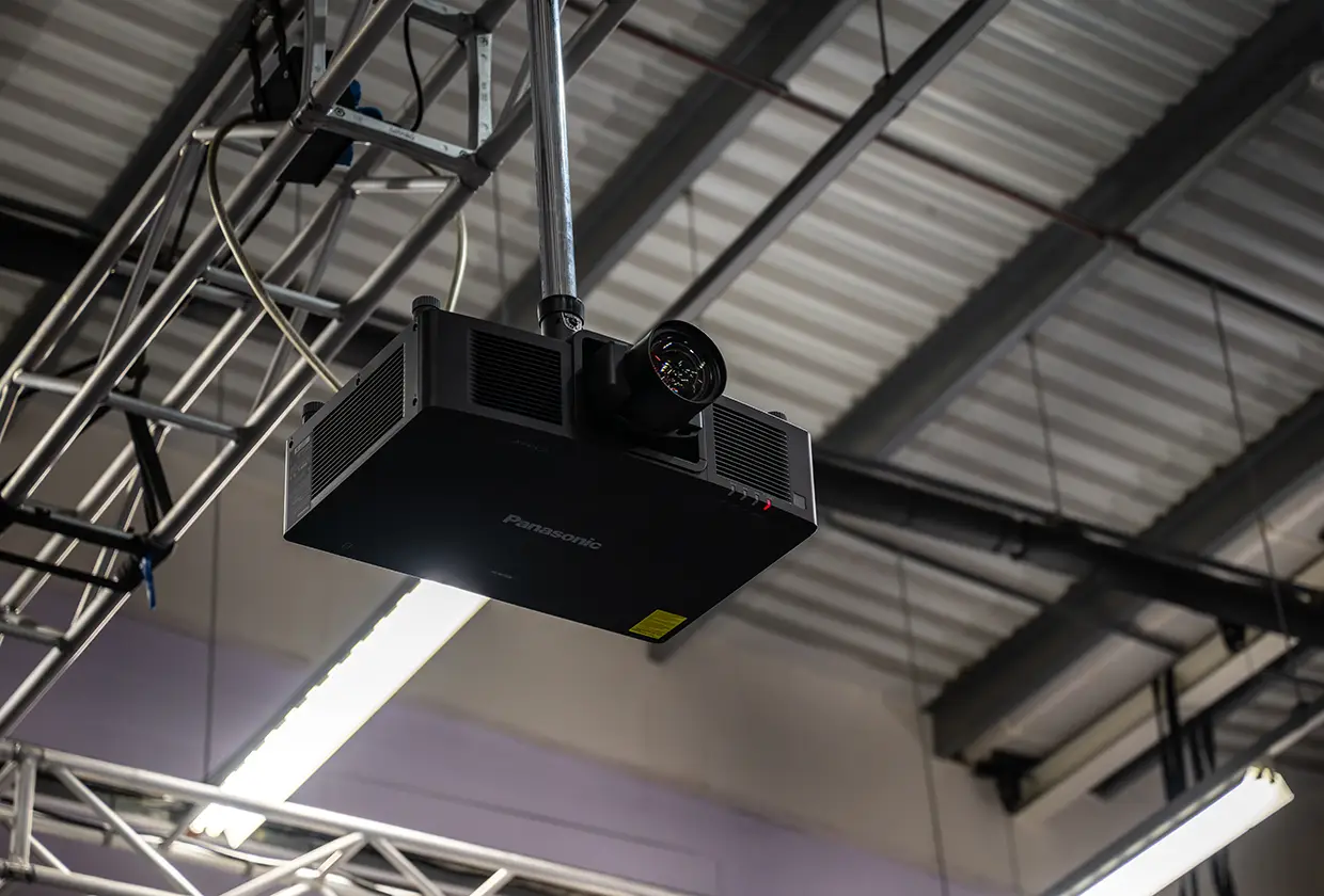 A high-performance Panasonic PT-MZ20K laser projector forms the centrepiece of the video system, delivering 20,000 lumens of brightness and WUXGA resolution for high-impact visuals even in daylight. It’s paired with a motorised zoom lens for versatile throw distances.