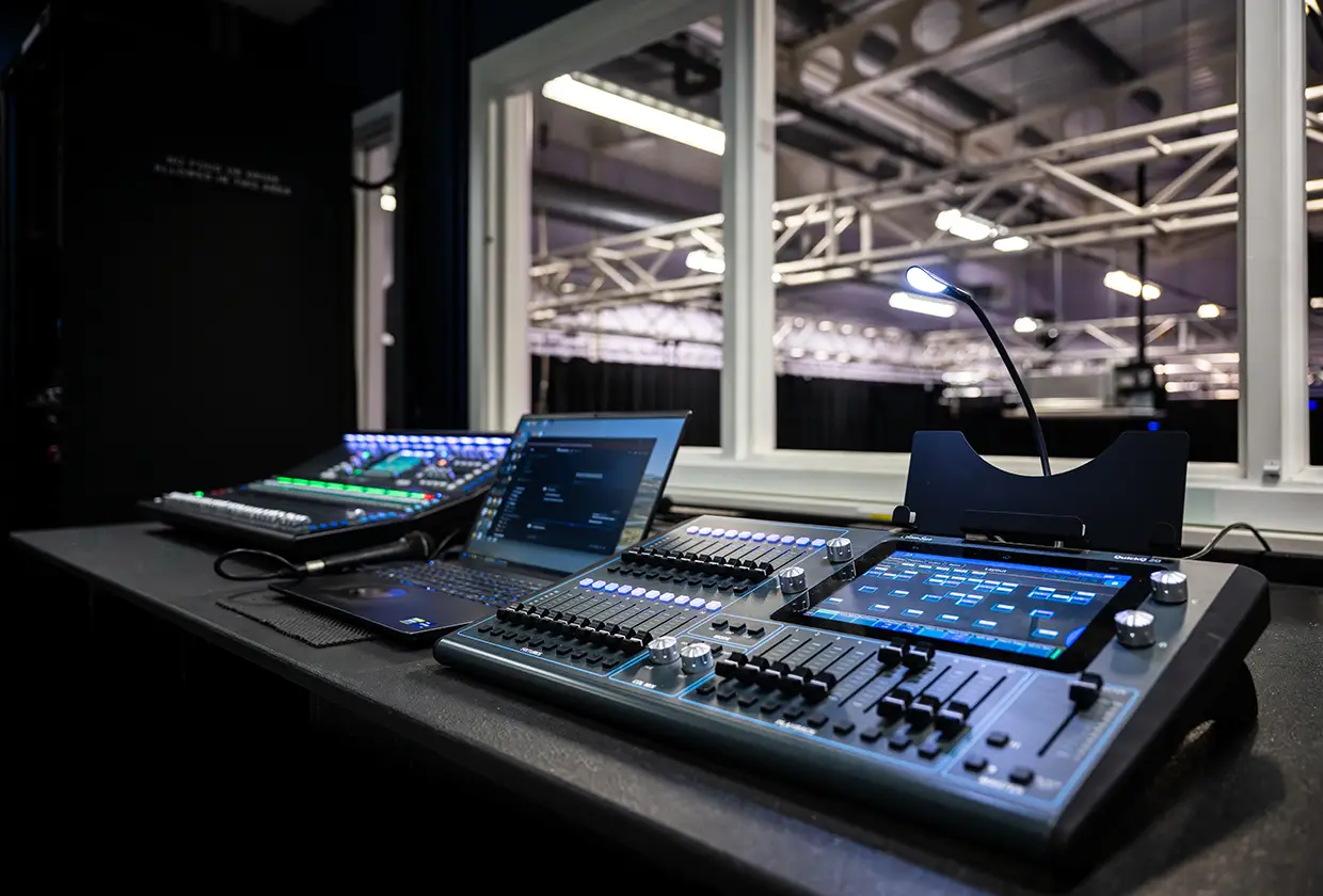 An Allen & Heath SQ-7 digital mixing console serves as the heart of the control system, offering advanced processing in a compact footprint. A dust cover was also supplied to preserve the console when not in use. Stage monitoring is handled by RCF NX 12-SMA powered wedges, supplied with covers, stands, and all necessary cabling for fast setup and flexibility.