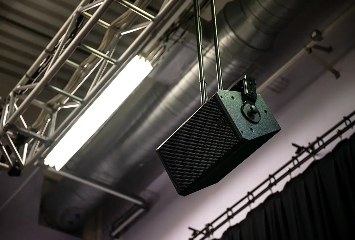 The system uses a combination of RCF Compact C45 and M10 loudspeakers, with S29 subwoofers providing the low-frequency support. The subs are securely flown using custom hardware, ensuring clean lines and optimal sound dispersion. System amplification is provided by Linea Research Dante-enabled amplifiers, offering power and networked control.