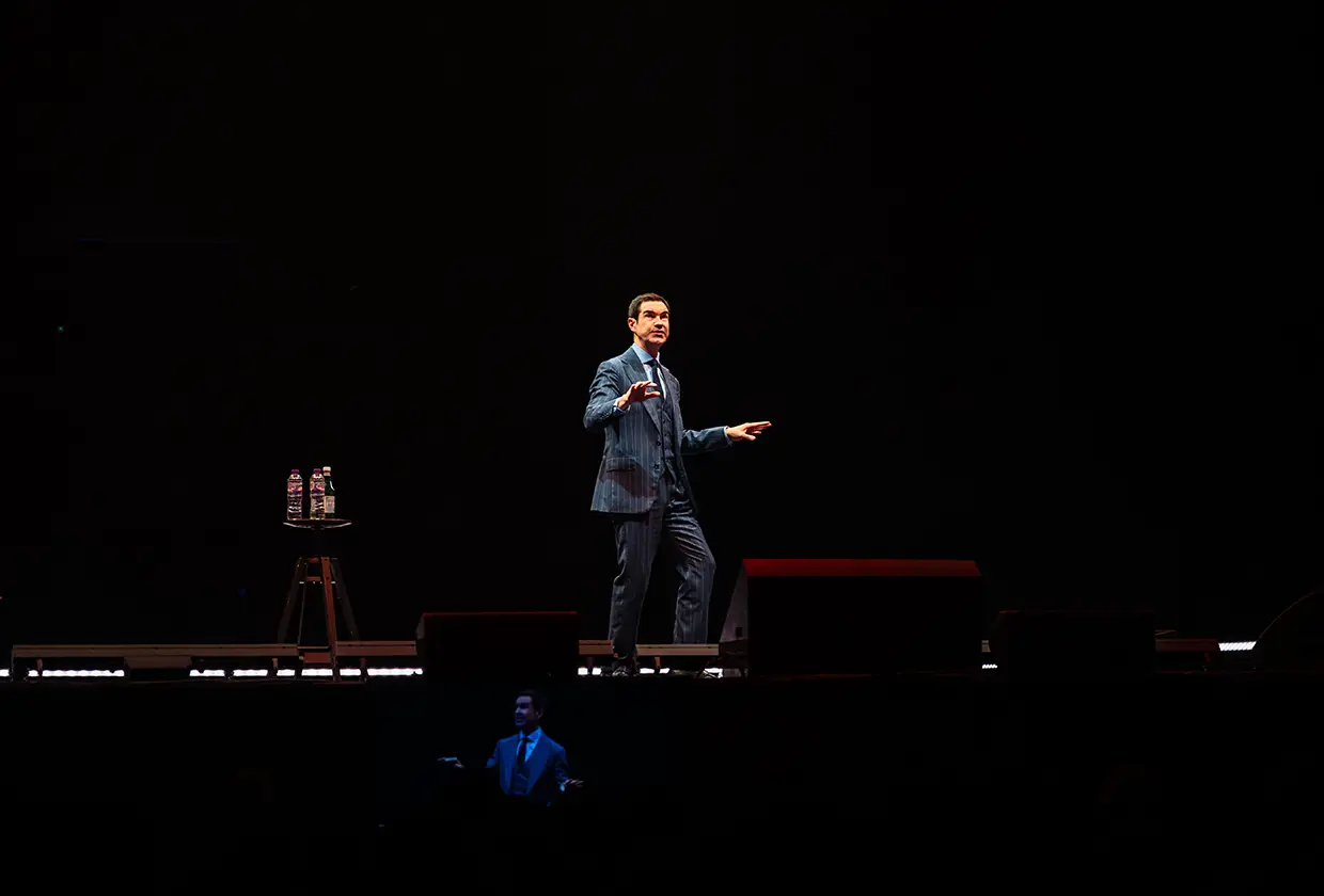 While the show centred around a single stand-up performer in an in-the-round format, the audio, lighting, video and rigging requirements were no less complex than those of a touring music act. The brief called for clarity of vocal reinforcement in large spaces, cinematic lighting, high-resolution video delivery, and a rigging infrastructure that would allow for fast, repeatable daily setups across the tour schedule.